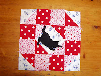 Vandaag tussendoor nog even bezig geweest met de applicatie van de kat. Ik heb eerst het patroon op freezerpapier getekend, toen op de goede kant van de stof gestreken, en op de andere kant vliesofix gestreken. Toen uit geknipt, papiertjes eraf, en toen de kat op het blok gestreken.