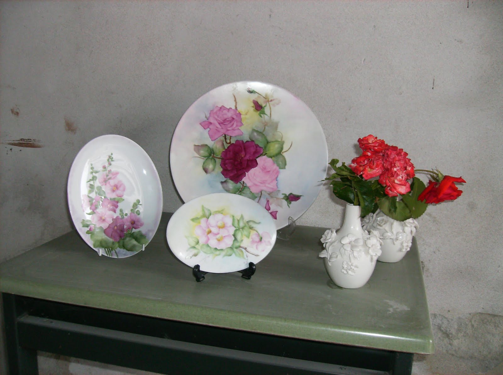 Achter in de schuur stond een mevrouw die prachtig porselein beschilderde, volgens mij ook een hele leuke hobby. Moet je eens kijken hoe mooi zij schildert, de rozen zijn net echt.Toen we daar waren moesten de quilten die buiten hingen naar binnen want jammer genoeg begon het te regenen.