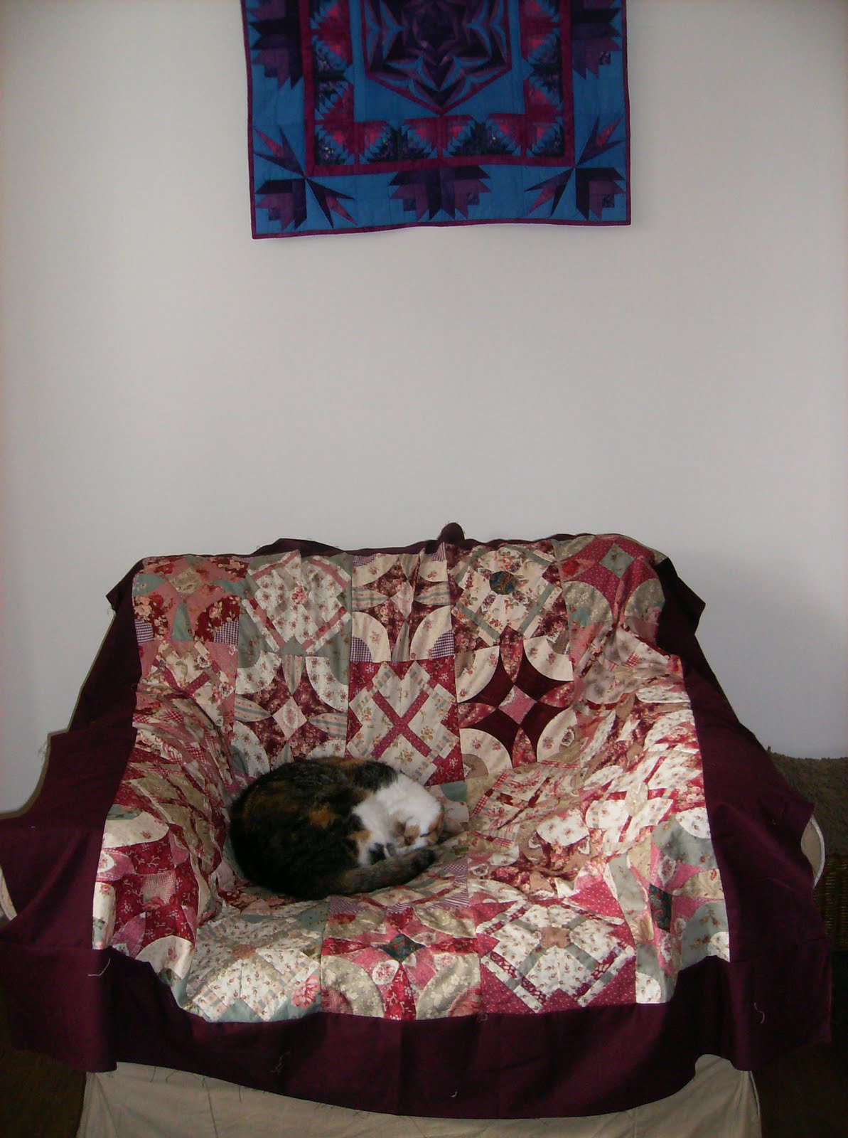 Ik ga goed op de quilt van het vrouwtje passen, kan zij mooi bezig met appliceerstukjes voor de rand te maken.