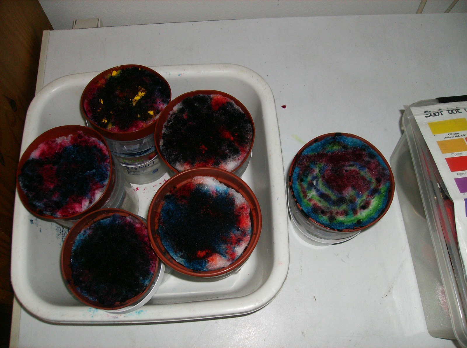 Ik heb bloempotjes met gaatjes onderin in yoghurtemmertjes gedaan, daarin de voorgeweekte poplin(in soda-ash en zout) gepropt en daar weer het sneeuw overheen. De emmertjes in de bak heb ik bestrooid met het poeder van de procionverf en het emmertje naast de bak heb ik kant en klare verf gedruppeld.....