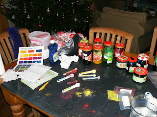 Toen nog een lapje in een bakje en bespoten met allemaal kleuren paars en turguoise en een nog een lapje met knoeisel en zelf er nog wat opgedrupt....