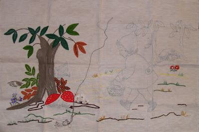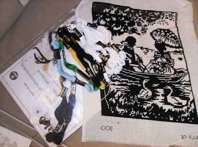 Een borduurpatroon van een kat op een geel kussen, jaren 70/80, een borduurpatroon van paard en sjees(weet ik niet of dat ook de holandse benaming is), een net begonnen borduurlap, en een grote voorgedrukte zwarte lap(tafelkleed) waar een aantal bloempjes op zijn geborduurd....