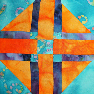 12. Deze wordt heel vrolijk! Echt jouw kleuren Klaske. Ik hou ook van felle kleurtjes en batik. Het ligt aan de stemming. Romantische stofjes vind ik ook erg mooi. Eigenlijk vind ik de meeste quiltstoffen mooi, alleen van bruin krijg ik de kriebels.