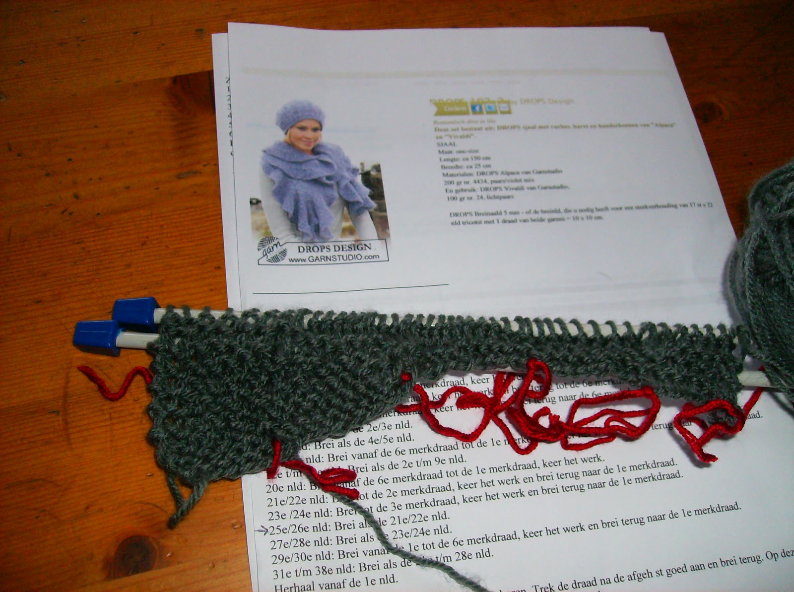 Ik moest even uitvissen hoe ik het breien moest, maar daar ben ik geloof ik in geslaagd, maar ben bang dat het wol te dik is voor deze sjaal.