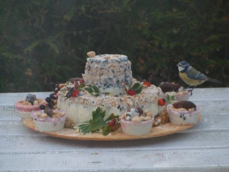 leuk zo'n vogeltaart, dat wordt genieten voor hen en jou. hier genieten de vogels volop van een pot pindakaas,zaad in het vogelhuisje en vetbolletjes groetjes Bernadette