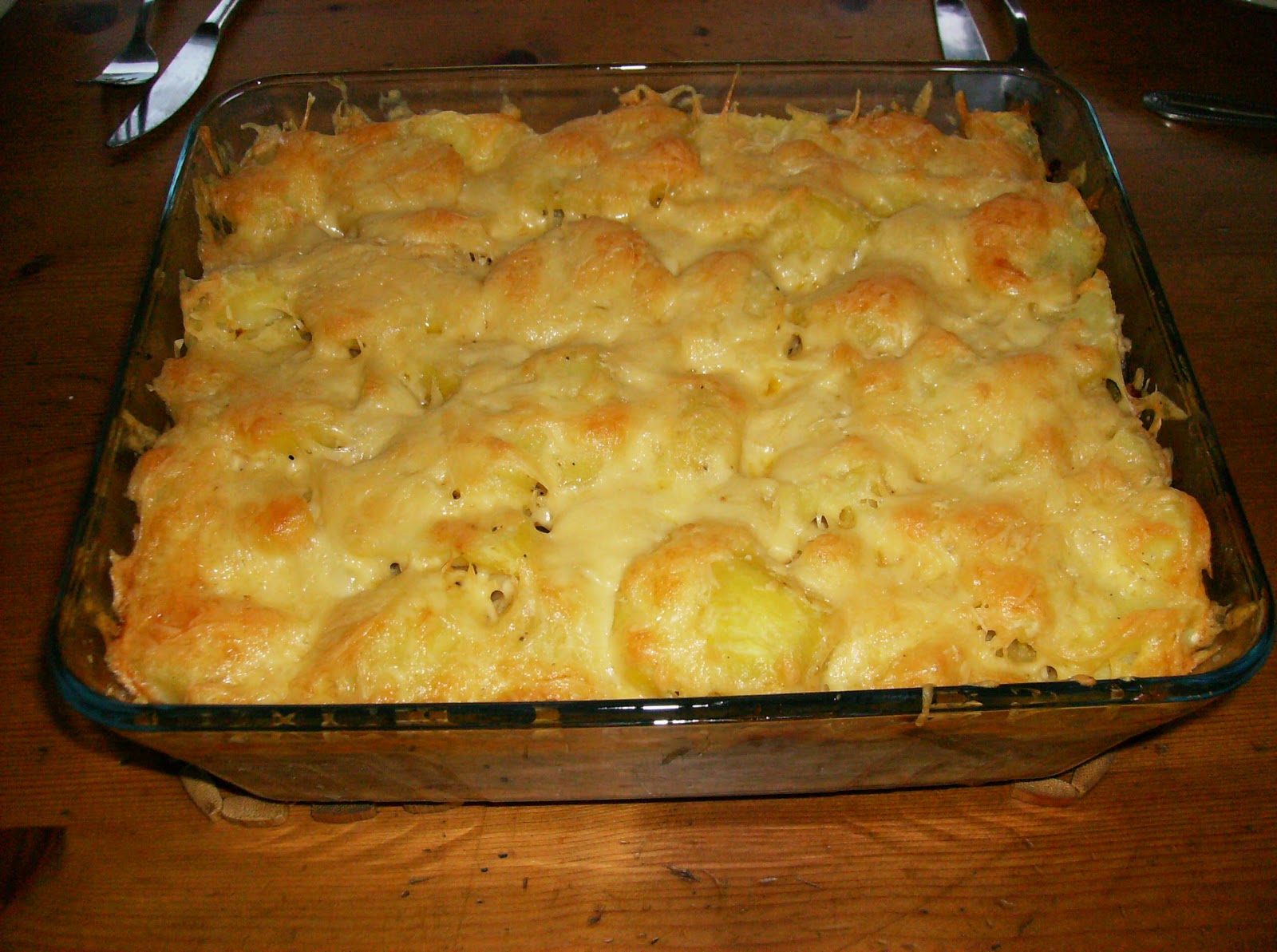 Toen heb ik de voorgegaarde aardappelen in een flinke ovenschaal gedaan, de gehakt-groentemengsel daar weer overheen, en de overgebleven aardappelen heb ik er weer bovenop verdeeld.